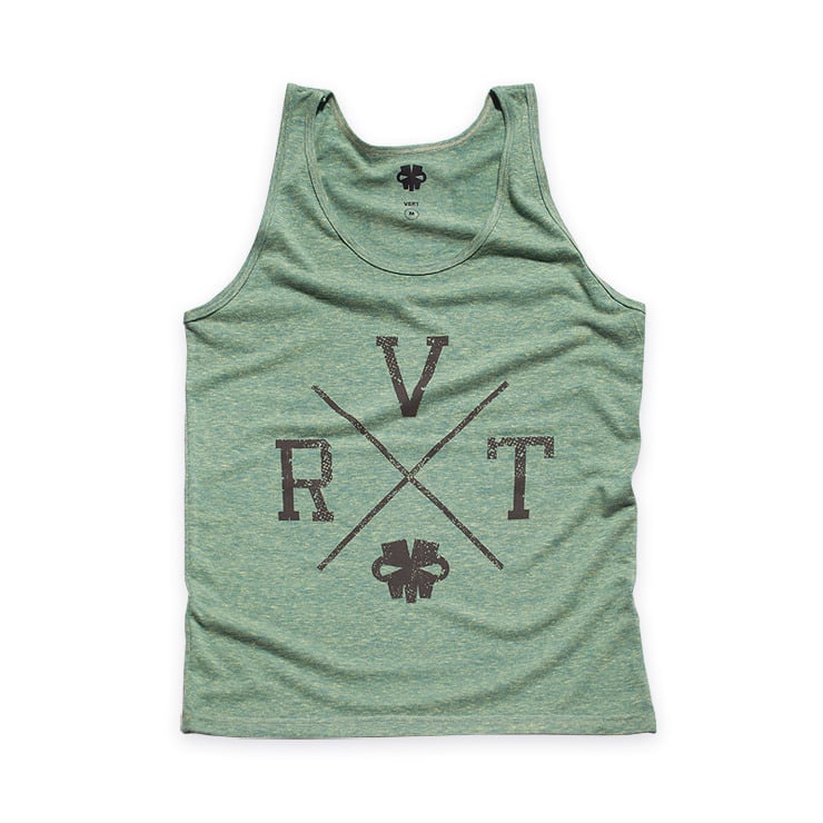 Constructed with 150 gsm., 50% polyester / 25% cotton / 25% rayon, fine jersey knit body fabric with ribbed trim. Features a water-based front chest print and labeling details.